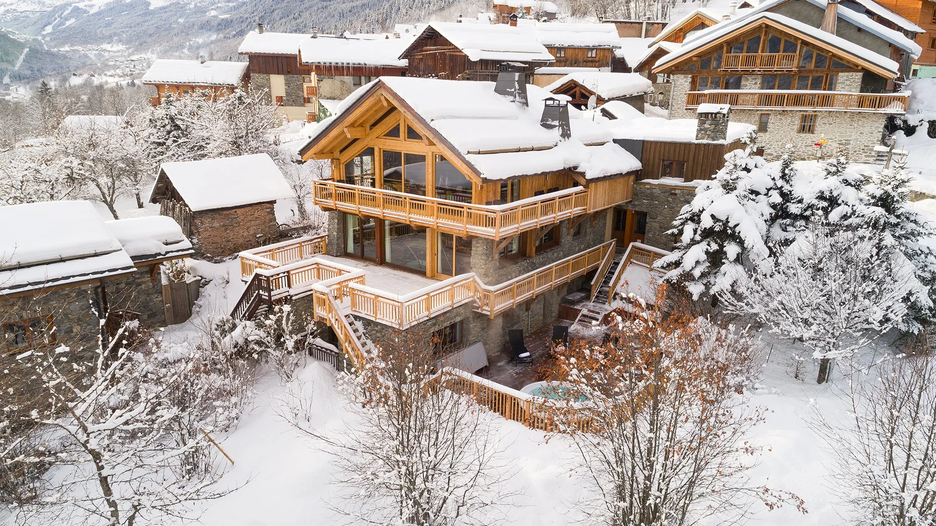 The chalet's crowning jewel is its magnificent top floor, with double height ceilings and enormous windows flooding the room with light. The majestic stone fireplace and opulent seating area are a wonderful place to gather with family and friends for canapés and champagne, and the spacious dining area provides a sumptuous setting for delicious four-course meals. Outside on the terrace, the sunken hot tub beckons, and the seating area with fire pit is the perfect place from which to admire the views.